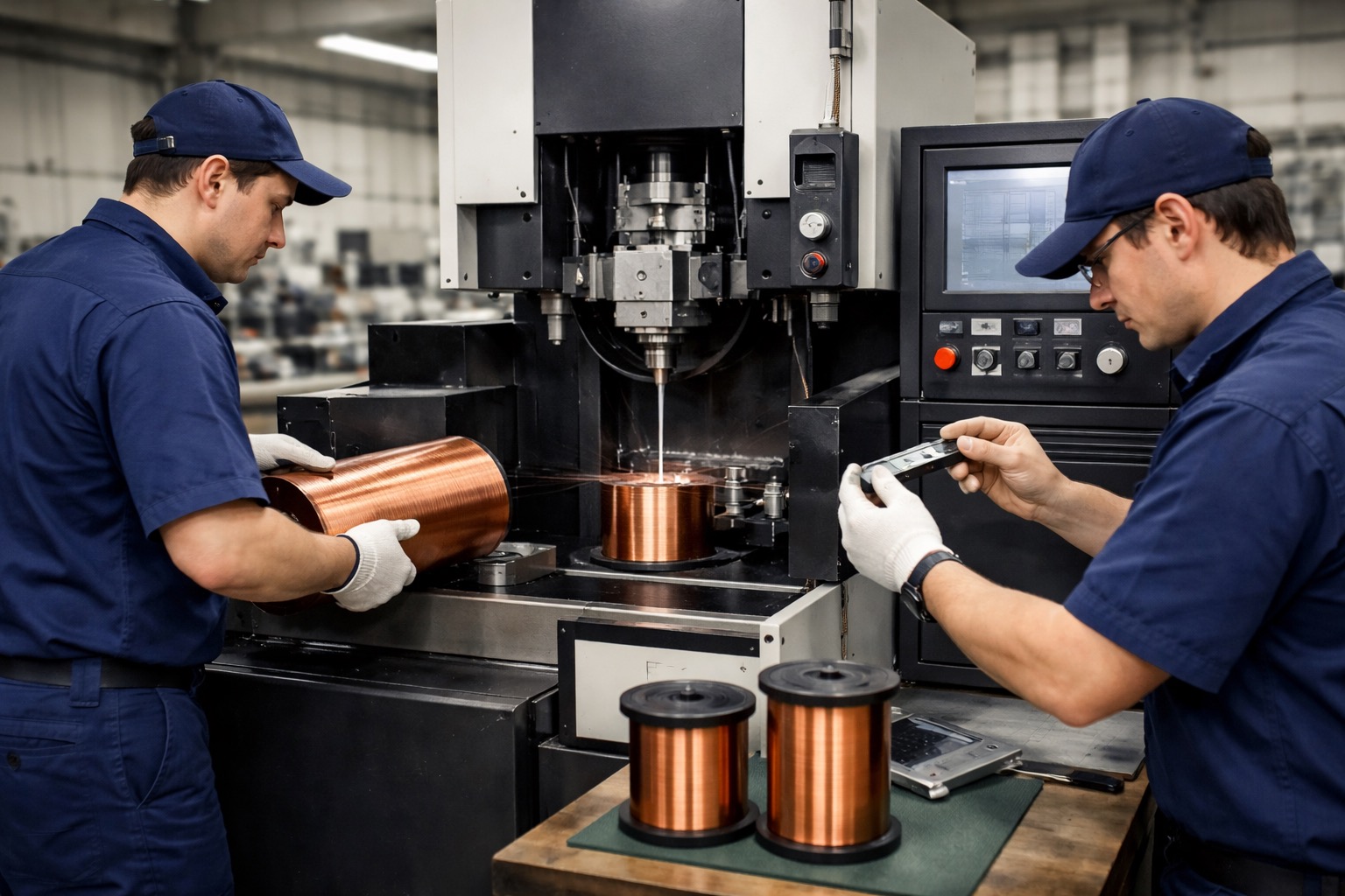 円筒状の銅材を機械で細いワイヤーへ加工するお仕事です。